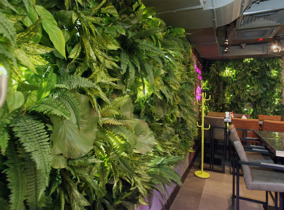 «Зеленая стена» порядка 3,5 кв.м. - в проекте вертикального озеленения использовались растения: антуриумы, маранты, сциндапсусы, филодендроны и пр.