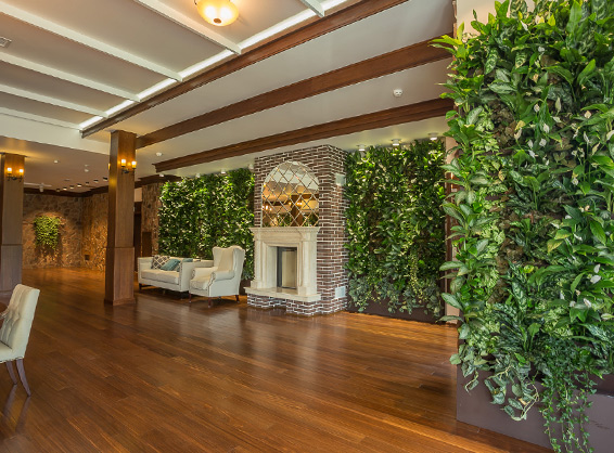 Входную зону загородного клуба украшают 3 эффектные фитостены, площадью 24 кв.м, за которой регулярно ухаживают наши фитобиологи. Владельцам захотелось буйства красок - и поэтому в стенах прекрасно соседствуют: традесканции и драцена лемон лайм, кротоны и фатсии, аглаонемы и маранты, а также традиционные сциндапсусы.