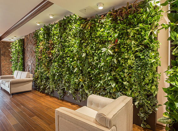 «Зеленая стена» порядка 3,5 кв.м. - в проекте вертикального озеленения использовались растения: антуриумы, маранты, сциндапсусы, филодендроны и пр.