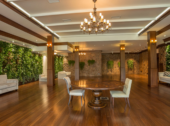 Входную зону загородного клуба украшают 3 эффектные фитостены, площадью 24 кв.м, за которой регулярно ухаживают наши фитобиологи. Владельцам захотелось буйства красок - и поэтому в стенах прекрасно соседствуют: традесканции и драцена лемон лайм, кротоны и фатсии, аглаонемы и маранты, а также традиционные сциндапсусы.